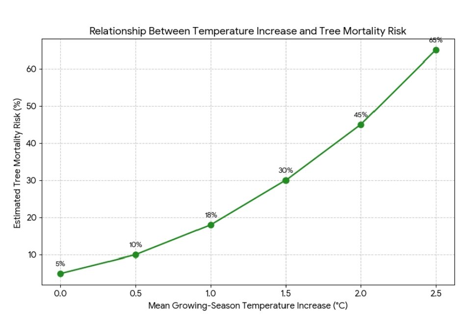 The graph shown above illustrates a simplified but widely observed relationship: as mean growing-season temperatures rise, the probability of tree mortality increases nonlinearly. While actual thresholds vary by species and region, the trend underscores a fundamental reality. Even modest warming can push trees toward physiological limits that were rarely tested under pre-industrial climate conditions.