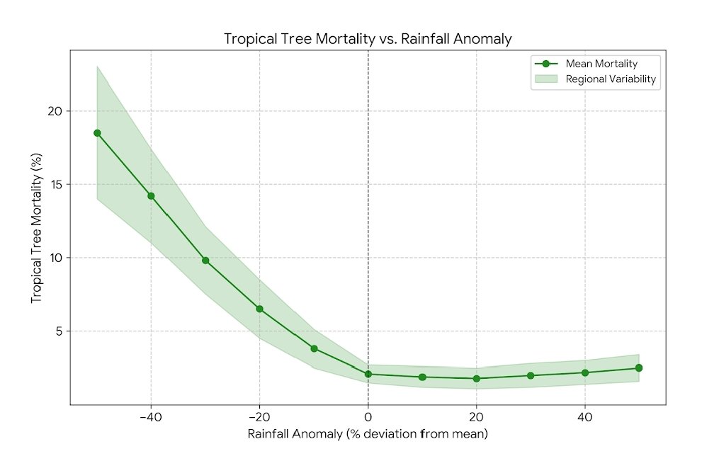 The table demonstrates a nonlinear response to rainfall deficits. Moderate anomalies produce modest increases in mortality, but severe deficits trigger dramatic increases, reflecting the high sensitivity of tropical trees to water availability.