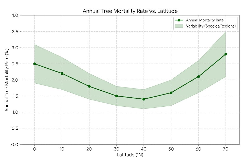 The table shows that mortality rates tend to increase at higher latitudes, particularly as warming disrupts previously stable cold environments. Trees in northern boreal zones are now experiencing mortality rates several times higher than historical baselines.