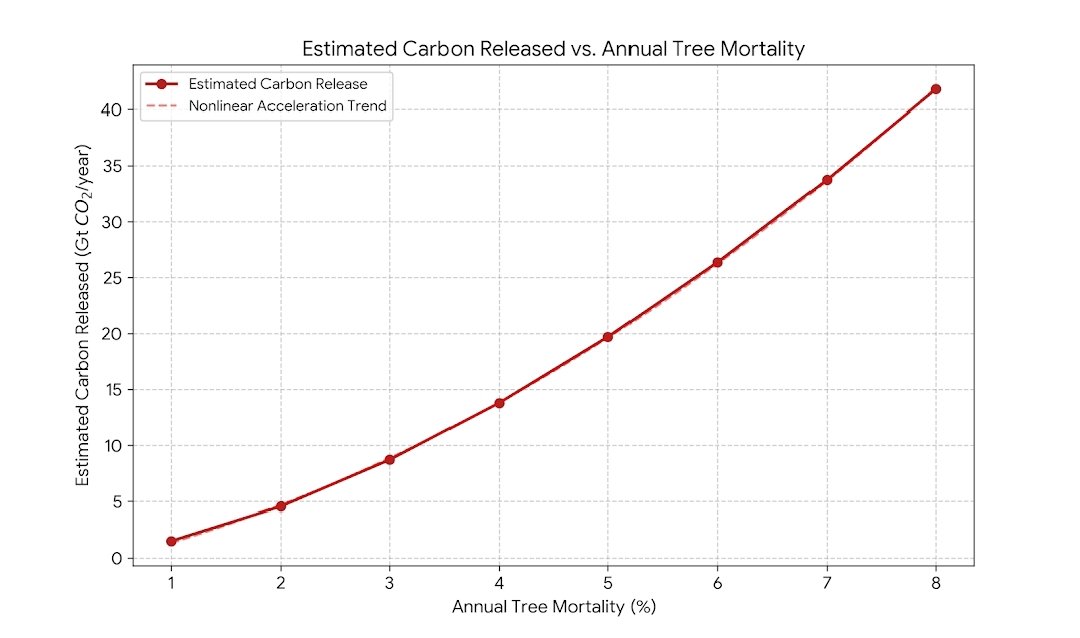 Even modest increases in tree mortality can release substantial carbon quantities, illustrating the amplifying feedback between forest die-off and global warming.