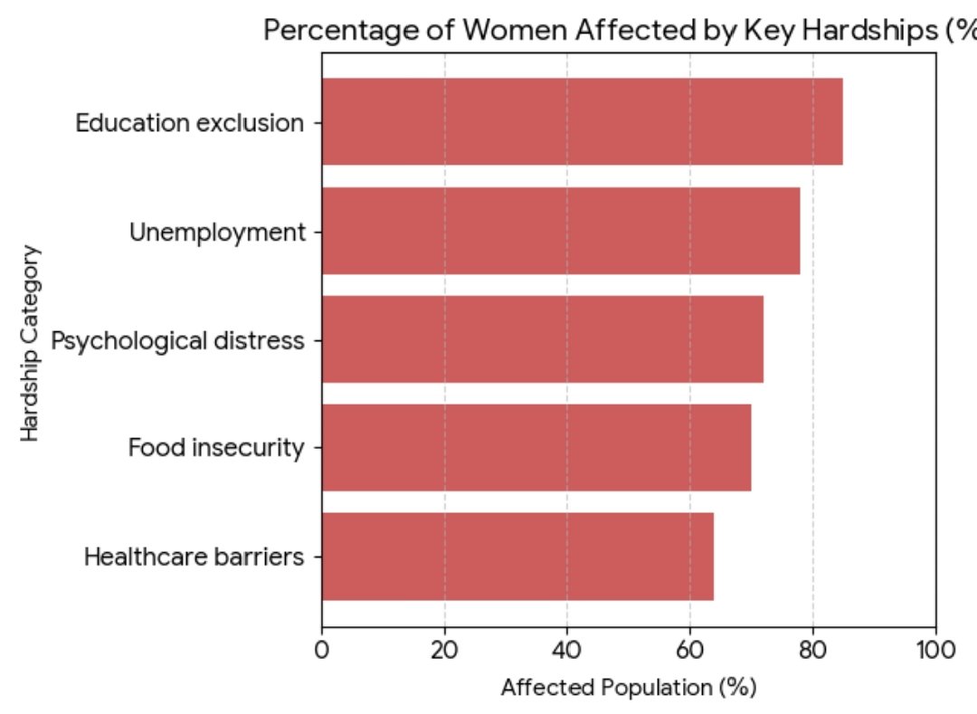 Afghan women in 2025 face systemic exclusion across education, employment, healthcare, and public participation. The combined effects of policy restrictions, social norms, and prolonged conflict have created a multi-dimensional crisis. Key findings include:
