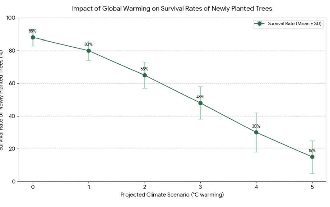 Under extreme warming (>3°C), reforestation success drops to 20% — only 1 in 5 planted trees survive.