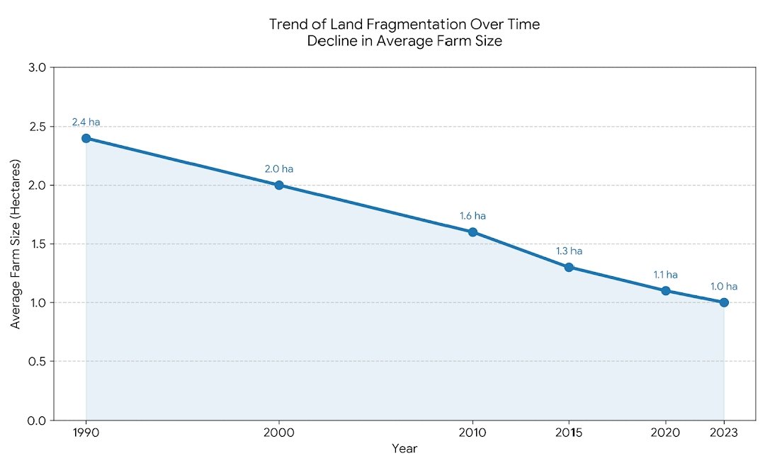 One of the most serious structural problems is the prevalence of small and fragmented landholdings. Due to population growth and inheritance laws, farmland is continuously divided among family members. Over generations, this leads to extremely small plots that are economically unviable.