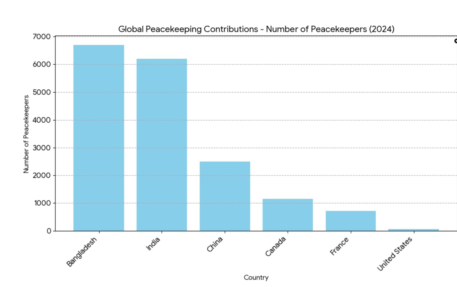 Interpretation: Despite its smaller population, Canada maintains one of the world’s highest per capita contributions to UN peacekeeping missions, showing its dedication to maintaining international stability.