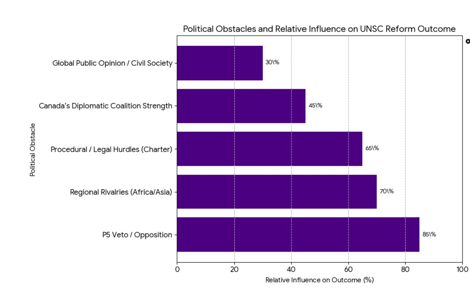 4. “Practical politics — P5 will block changes that dilute their influence.” Even if the GA supports reform, amending the Charter is effectively blocked without at least P5 acquiescence; the P5 have incentives to preserve status and veto prerogatives. 5. “Canada’s own weaknesses — past campaign failures show limits.”