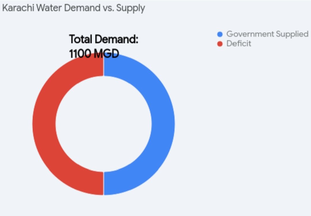 Karachi, Pakistan’s largest city, faces a severe water deficit. The city requires around 1,100 million gallons per day (MGD) but receives only around 550–600 MGD. The rest is supplied through private tankers, many of which operate illegally and sell water at high prices.