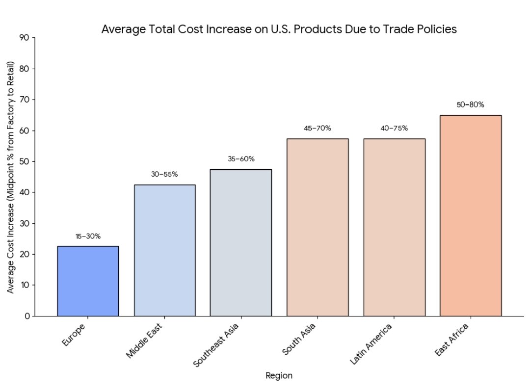 Consumers in countries with high tariffs, taxes, and shipping costs pay far more for U.S. goods than those in the U.S. or Europe. This reduces purchasing power, especially among middle- and lower-income groups.